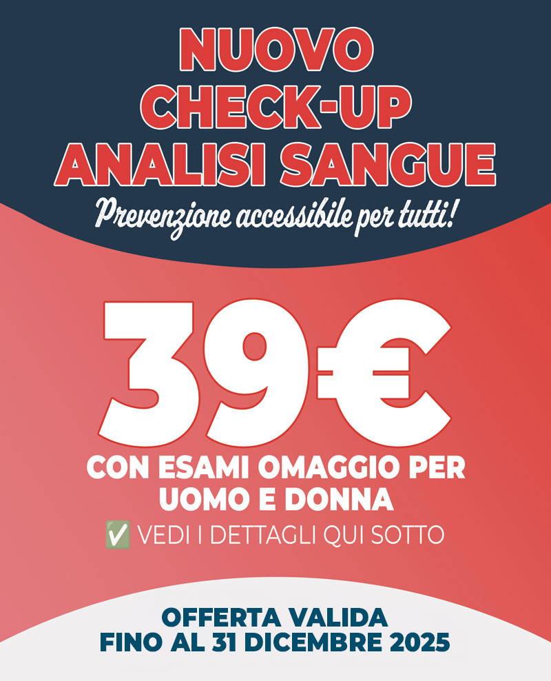 Emocromo completo, Azotemia, Creatininemia, Uricemia, Colesterolo Totale, Glicemia, Trigliceridi, Transaminasi GOT Transaminasi GPT, Gamma GT, Fosfatasi alcalina, Bilirubina Totale, Bilirubina Frazionata, Proteine Totali, Fosforo, Calcio, Amilasi, Magnesio, LDH, Albumina, Colinesterasi, Sodio sierico, Potassio sierico, PSA totale (per gli uomini) FT3, FT4, TSH (per le donne).